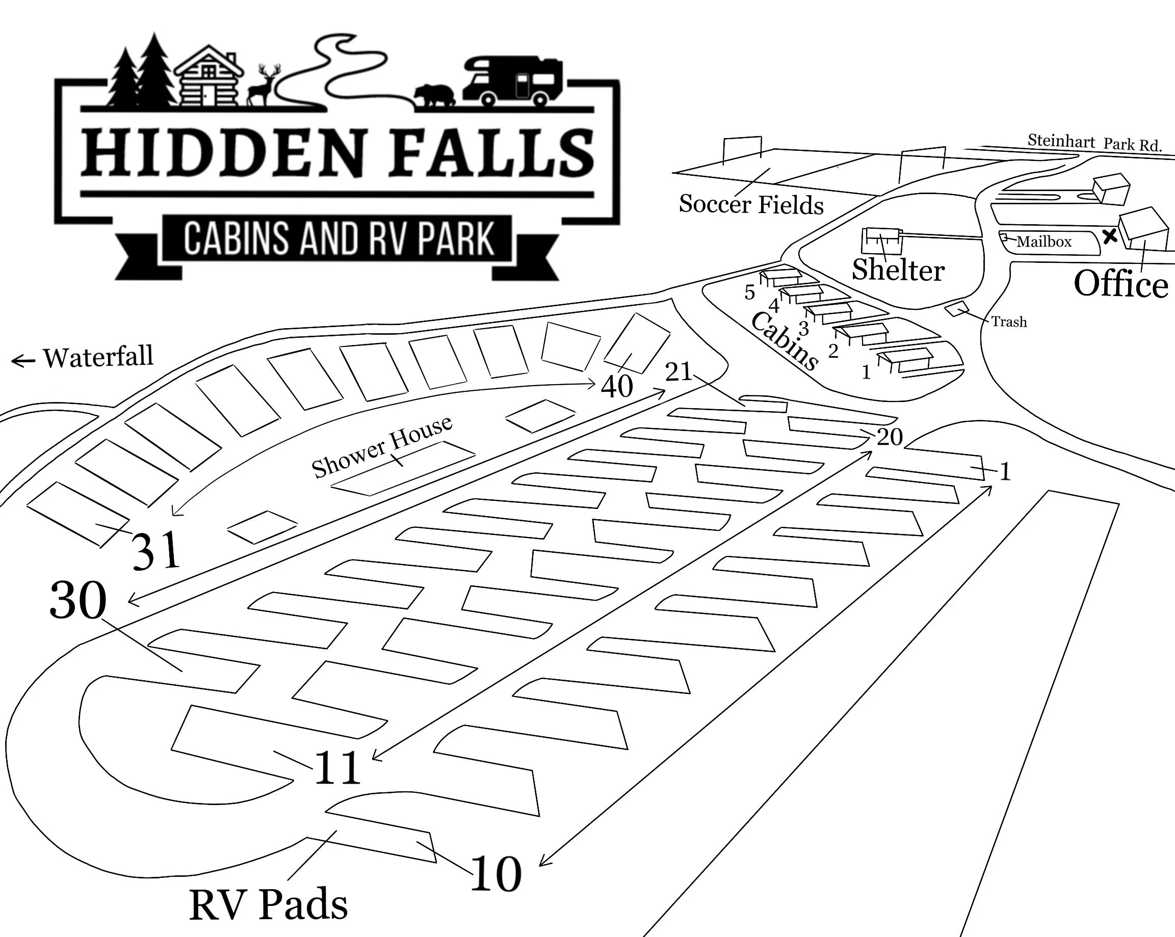 Hidden falls is not responsible for loss, damages or claims to property of guests due to fire, theft, accident or any other cause. ATV’s / Golf Carts are not allowed to be driven on the property by guests. They are for maintenance use only and are driven by staff. The management also reserves the right to refuse service to anyone.